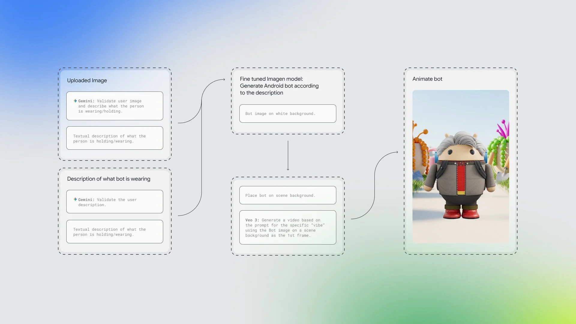 In close collaboration with the Google Developer Marketing and Google Pi teams, R/GA created the AI training assets to fine-tune and train the Imagen 3 model until we arrived at Android bots that reflected the users’ likeness through a vast array of fun accessories, elaborate clothing, and spot-on hairstyles.